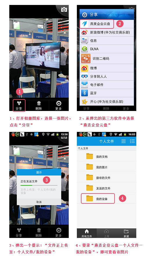 例如,将手机本地的图片共享到燕麦企业云盘里。此时,只需打开手机相册图库,选中需要共享的图片,点击“分享”,即可从第三方软件中选择“燕麦企业云盘”,此时系统会弹出一个提示“正在发送文件至个人文件/我的设备”,上传完成后,即可前往“燕麦企业云盘/个人文件/我的设备”中查看刚刚上传的图片。