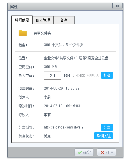 此外,还可以查看到该文件夹的位置、已用空间、创建时间、创建人、修改时间、修改人;对于该文件夹进行快捷分享或关注。不仅可以让企业用户快捷地了解到该文件夹的详细信息,而且还可以进行多种快捷操作,显著提高了办公效率。