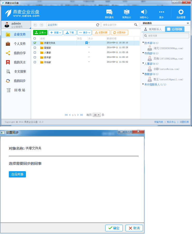 企业文件同步需管理员授权给指定的成员,该授权的成员拥有了同步权限之后才能开始同步。这样做的好处是减少了不必要的同步,以免占用太多的宽带资源。