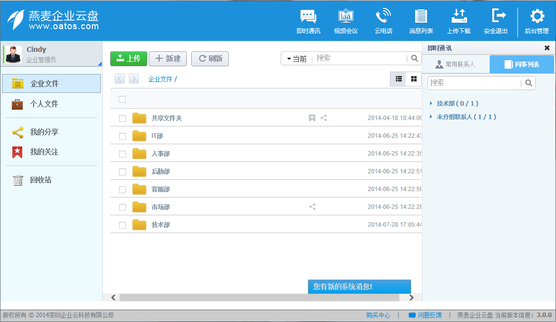 燕麦企业云盘(OATOS企业网盘)是深圳企业云科技有限公司研发出的创新型的企业云存储服务,提供免费的基础服务和私有云定制化服务,是一个企业文档分享与办公协同平台。