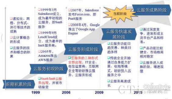 自SaaS 在20世纪90年代末出现以来,云计算服务已经经历了十多年的发展历程。云计算服务真正受到整个IT产业的重视是始于2005年亚马逊推出的AWS服务,产业界认识到亚马逊建立了一种新的IT服务模式。在此之后,谷歌、IBM、微软等互联网和IT企业分别从不同的角度开始提供不同层面的云计算服务,云服务进入了快速发展的阶段。云服务正在逐步突破互联网市场的范畴,政府、公共管理部门、各行业企业也开始接受云服务的理念,并开始将传统的自建IT方式转为使用公共云服务方式,云服务将真正进入其产业的成熟期。