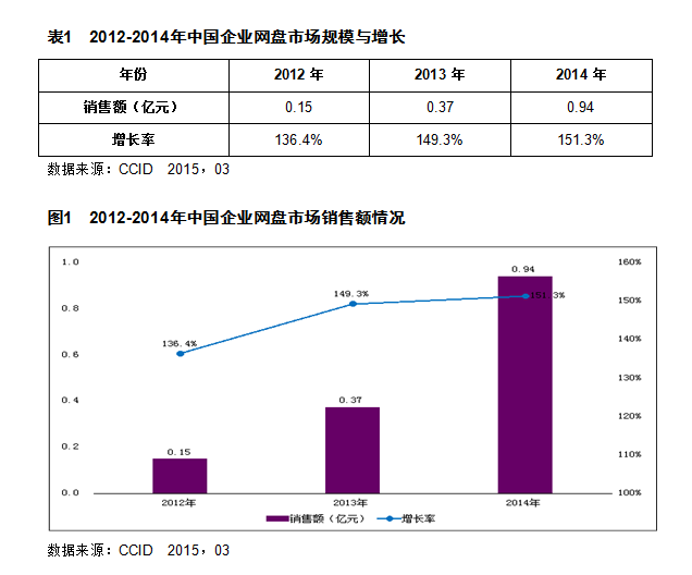 随着云计算技术的发展,基于云存储应用的企业网盘市场得到快速发展。越来越多的企业用户需要在工作中对大量业务文件进行共享和分发,企业网盘能够满足团队协同工作的需求。2014年,中国企业网盘市场规模为0.94亿元,同比增长151%,三年复合增长率为146%。