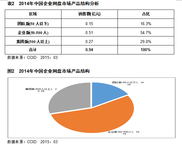 目前,中国企业网盘市场的销售主要集中在企业版,500人以下的企业客户更加倾向于购买标准化的企业版企业网盘,对文件传输、共享和发布等需求较高的客户会采用集团定制版。小型教育团队、创业团队和个别企业客户会集中使用团队版。2014年,企业网盘企业版的销售额为0.51亿元,占比55%,集团版销售额为0.27亿元,占比29%。