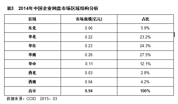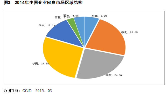 2014年,中国企业网盘区域市场中,华南、华东和华北区市场占比均在20%以上。华南区制造、传媒客户大量采用企业网盘使市场规模达0.26亿元,占比28%。相比较,东北、西北和西南区域的市场规模均较低。
