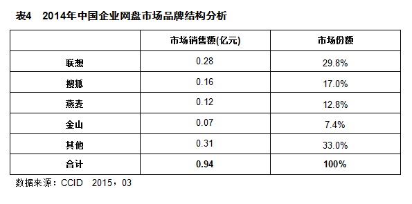目前,中国企业网盘市场中的竞争厂商除联想企业网盘运营时间较长外,搜狐、燕麦、金山等均是在2012年以后进入该市场。从产品运营和企业整体发展战略看,竞争厂商均不同程度加大云存储业务的发展,企业网盘业务得到不同程度的增长。2014年,联想企业网盘的市场销售额为0.28亿元,占比30%,位居第一。搜狐和燕麦不断加强企业网盘的研发和市场推广,市场销售额突破1000万元。