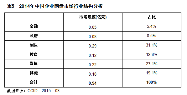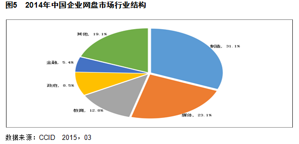 目前,中国企业网盘的应用行业主要集中在制造和媒体行业,大型制造企业内部的文件数量多、流转频率高;媒体行业图片、稿件、录音、视频等素材文件共享、发布等是企业网盘的主要需求点。2014年,中国企业网盘市场中制造行业市场规模为0.29亿元,市场占比31%。媒体行业市场规模为0.22亿元,市场占比23%。