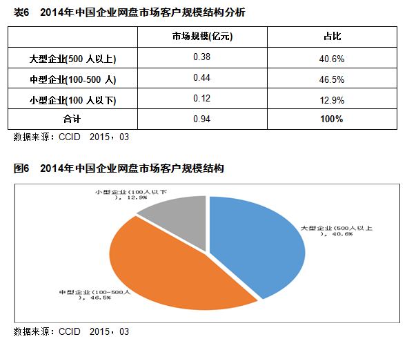 企业网盘的客户主要是大型集团客户为主,人员规模大、群组管理权限层级多、群组间文件保密性强等特点是大型企业客户需求关注点。大型集团企业客户通常为定制化服务,产品功能更全,价格相对较高。2014年,中国企业网盘市场中型企业客户细分市场规模为0.44亿元,占比47%。100人以下的小型企业客户产品价格相对较低,2014年市场规模为0.12亿元,占比13%。