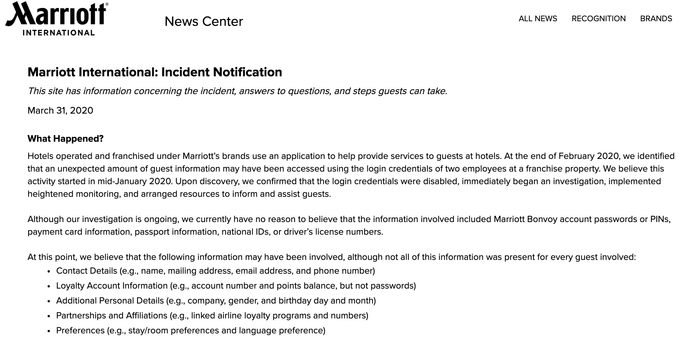 据官网介绍,这次被入侵可以追溯到1月中旬,最终在2月底发现特许经营店中两名雇员的登录凭证可能已访问了大量的客户信息。随后,万豪将登录凭证禁用,立即展开调查。