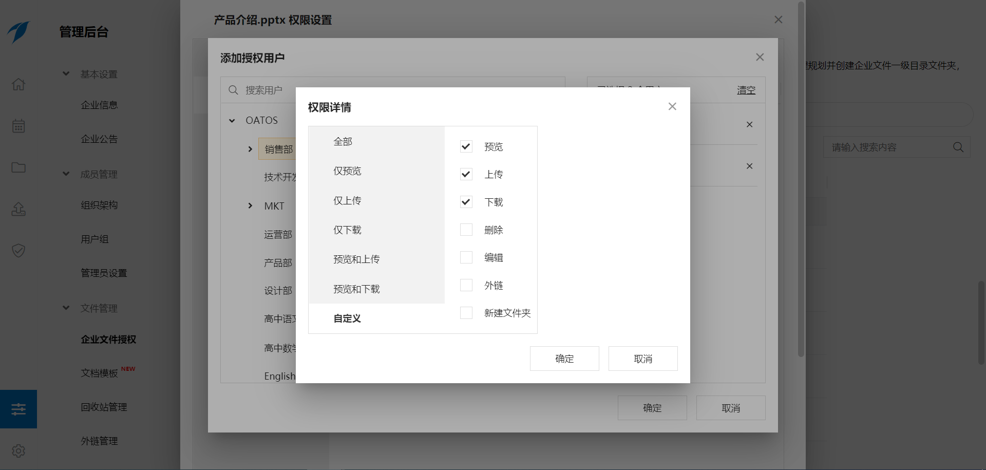 自由组合的权限模型,细化至预览、编辑、删除、外链等权限,针对用户、用户组、部门来分配管理文件权限。