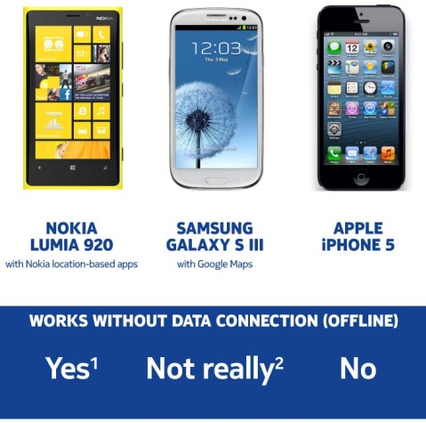 Nokia所比较的3款智能手机分别是采用Windows Phone平台的Nokia Lumia 920、采用Android平台的三星Galaxy S Ⅲ,以及采用iOS 6的苹果iPhone 5等,并根据脱机工作能力、转弯提示(turn by turn)导航、大众运输信息、3D及室内地图等功能进行评测,并认为Nokia手机在多数指标皆领先,垫底的大部份是iPhone 5。